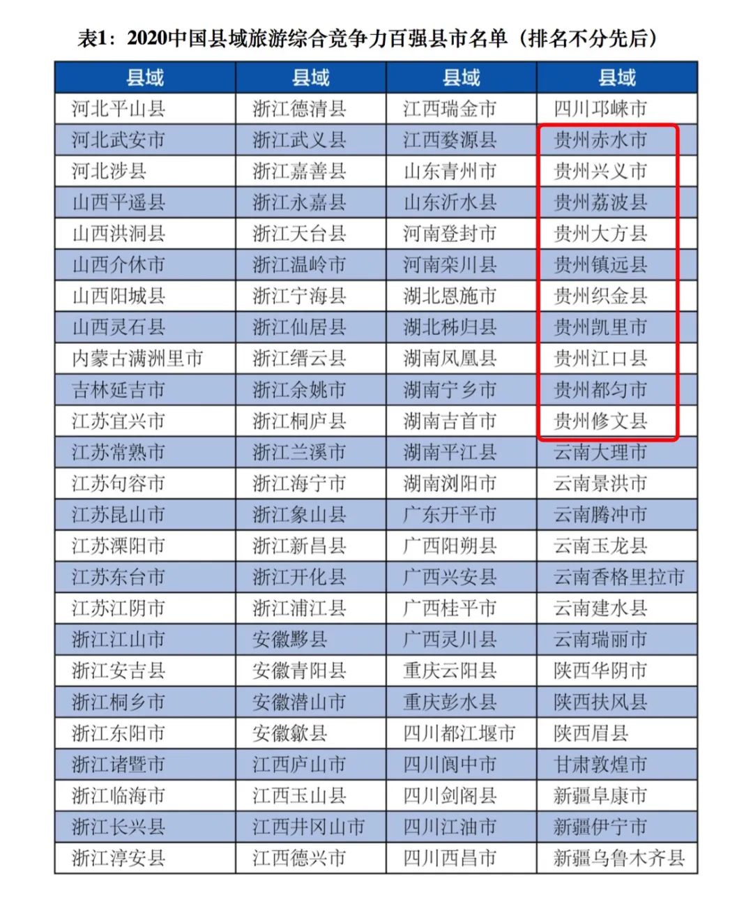 貴州省赤水市、興義市、荔波縣、大方縣、鎮(zhèn)遠(yuǎn)縣、織金縣、凱里市、江口縣、都勻市、修文縣等10個縣(市)上榜2020中國縣域旅游綜合競爭力百強(qiáng)縣市名單