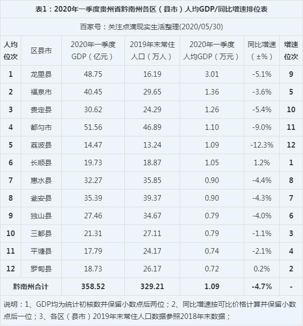 據(jù)上表1中數(shù)據(jù)顯示,黔南州2020年一季度實(shí)現(xiàn)GDP約358.52億元,與去年同期相比,同比下降4.7%。下降低于全國(guó)2.1%;按其2019年末常住人口329.21萬(wàn)人計(jì)算,人均GDP約合¥1.09萬(wàn)元,低于全國(guó)人均水平(約合¥1.45萬(wàn)元)。