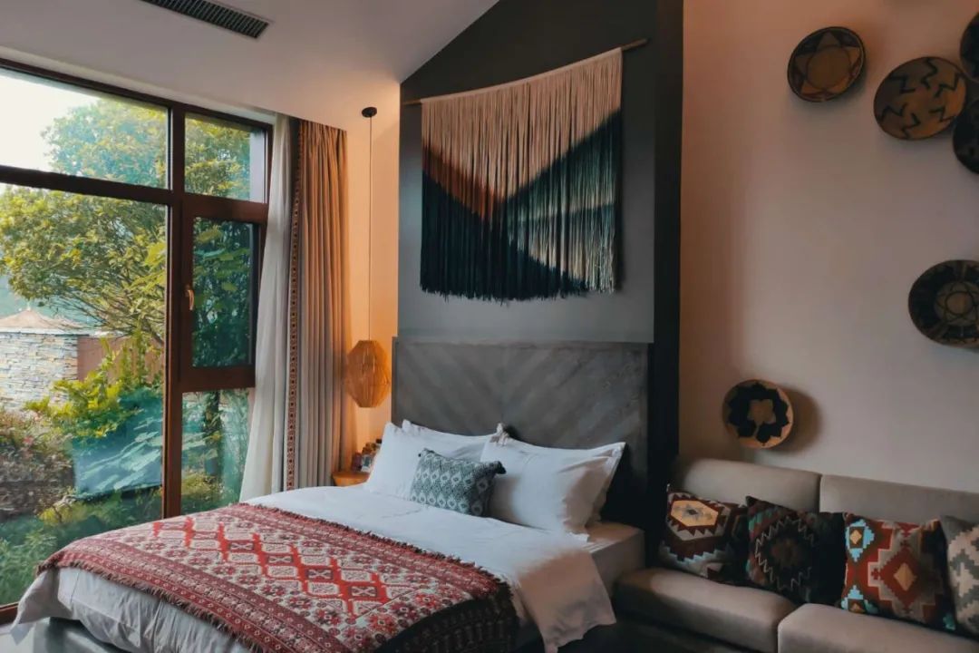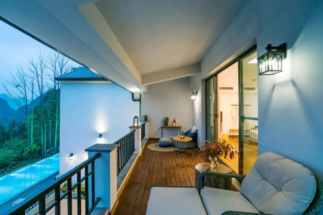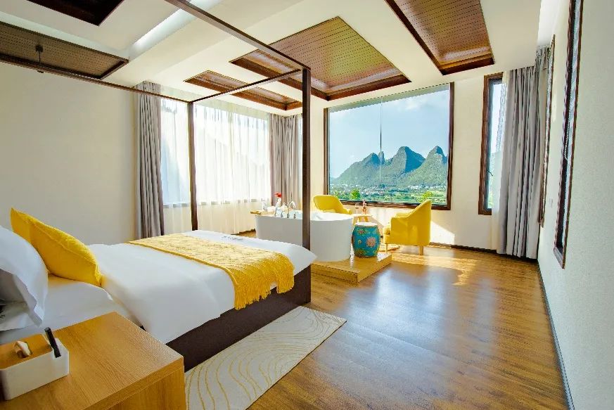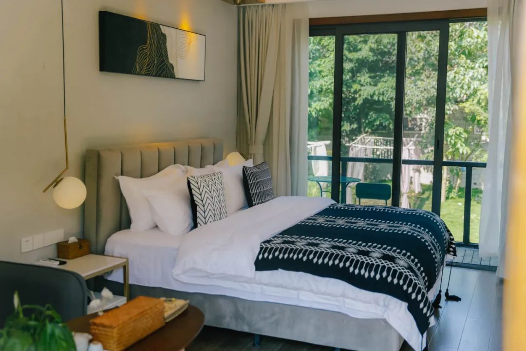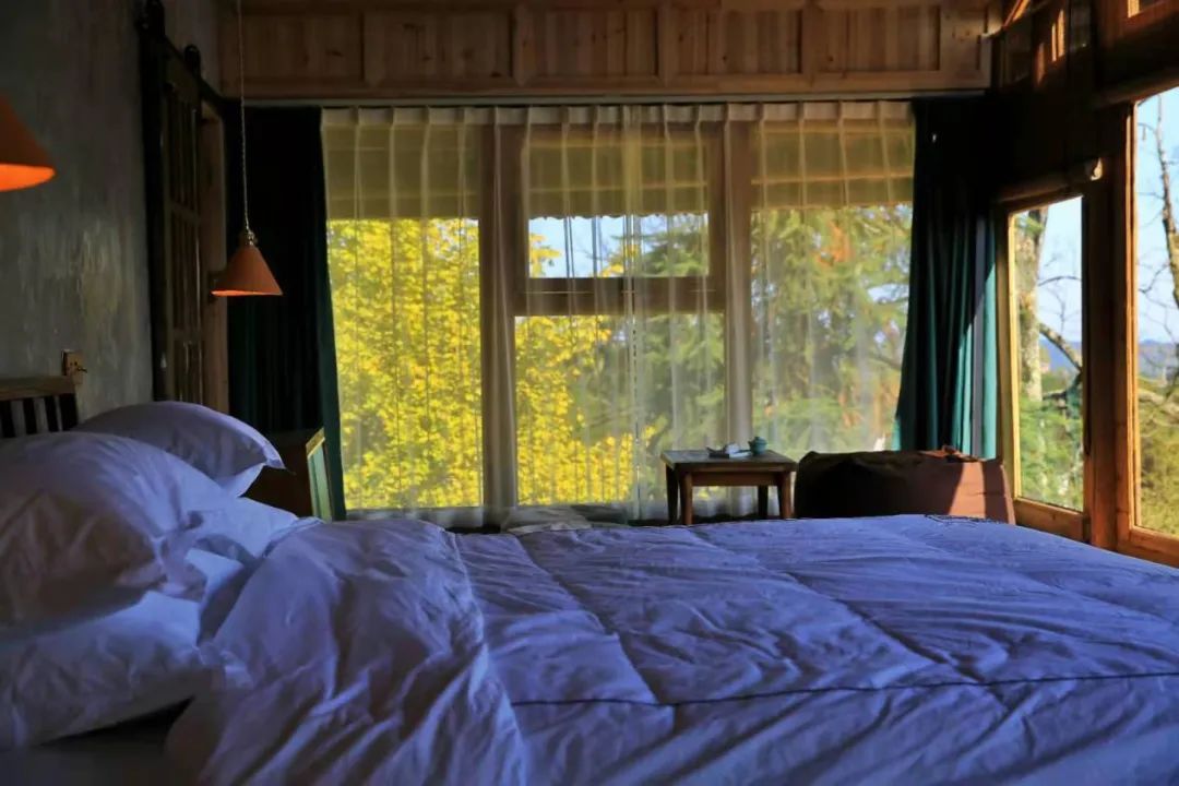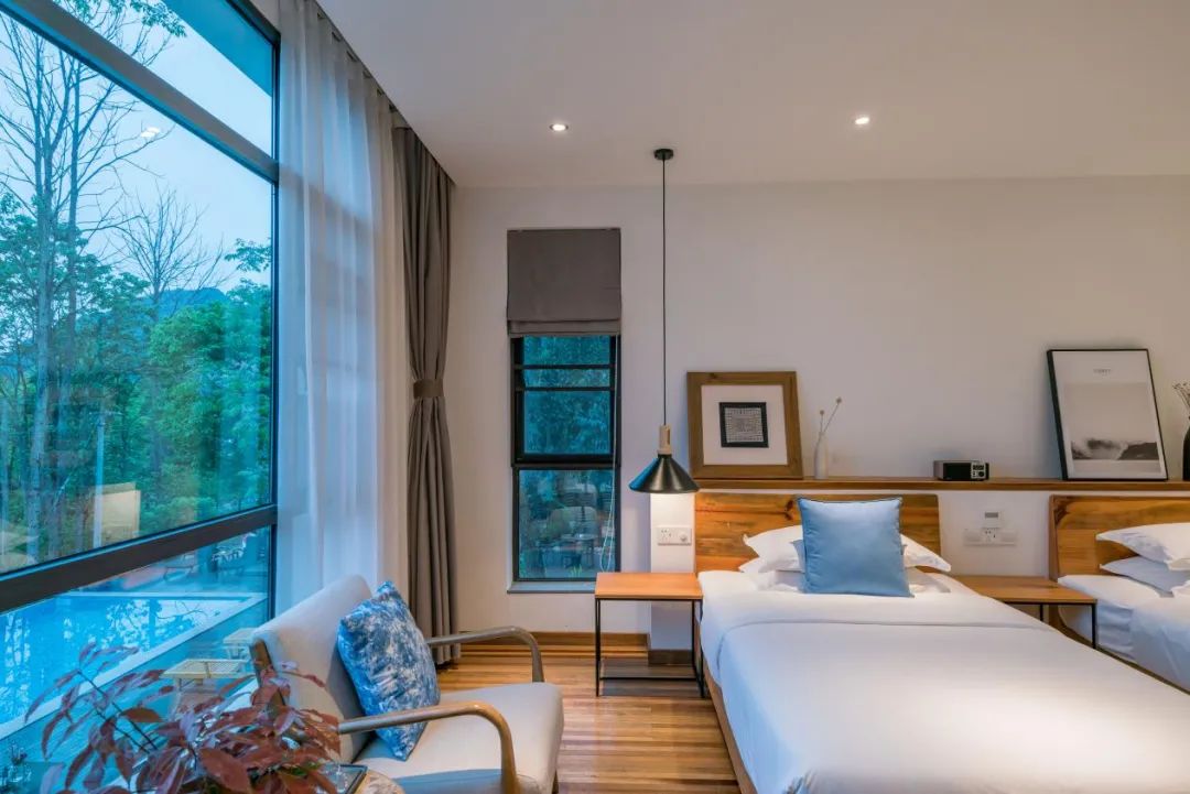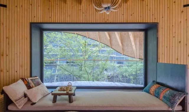 民宿里有隨處可見的玻璃落地窗,它們猶如一個(gè)個(gè)畫框,將景色裝裱起來,營造出一種“山似畫中山,人如畫中人”的意境。