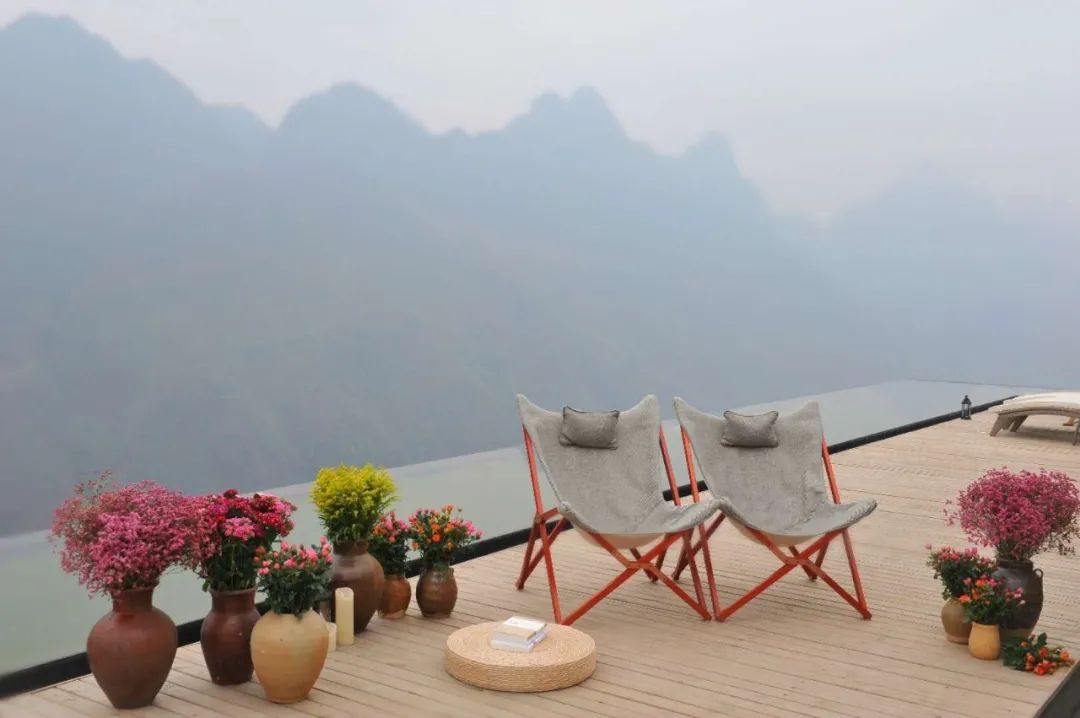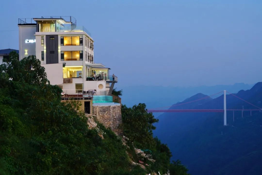 在客房陽臺(tái)憑欄眺望或通過300米長的山峰鐵索橋,不僅可以看云海、觀浩瀚星空、觸摸輕飄如紗的晨霧,還能眺望世界第一高橋(北盤江大橋)的雄偉壯觀,旖旎的尼珠河峽谷風(fēng)光盡收眼底。