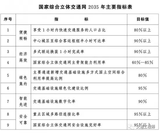 到2035年,基本建成便捷順暢,經(jīng)濟(jì)高效,綠色集約,智能先進(jìn),安全可靠的現(xiàn)代化國家綜合立體交通網(wǎng),實現(xiàn)國際內(nèi)部互通互通,全國主要城市立體暢達(dá),縣級建筑物有效覆蓋,有力支撐“全國123出行交通圈”(都市區(qū)1小時通勤,城市群2小時通達(dá),全國主要城市3小時覆蓋)和“全球123快貨物流圈”(國內(nèi)1天送達(dá),周邊國家2天送達(dá),全球主要城市3天送達(dá))。交通基礎(chǔ)設(shè)施質(zhì)量,智能化與綠色化水平居世界前列。交通運輸全面適應(yīng)人民日益增長的美好生活需要,有力保障國家安全,支撐基本實現(xiàn)社會主義現(xiàn)代化。