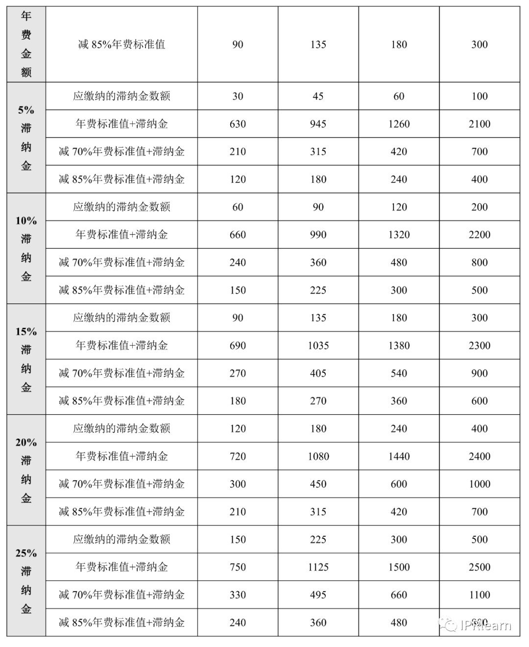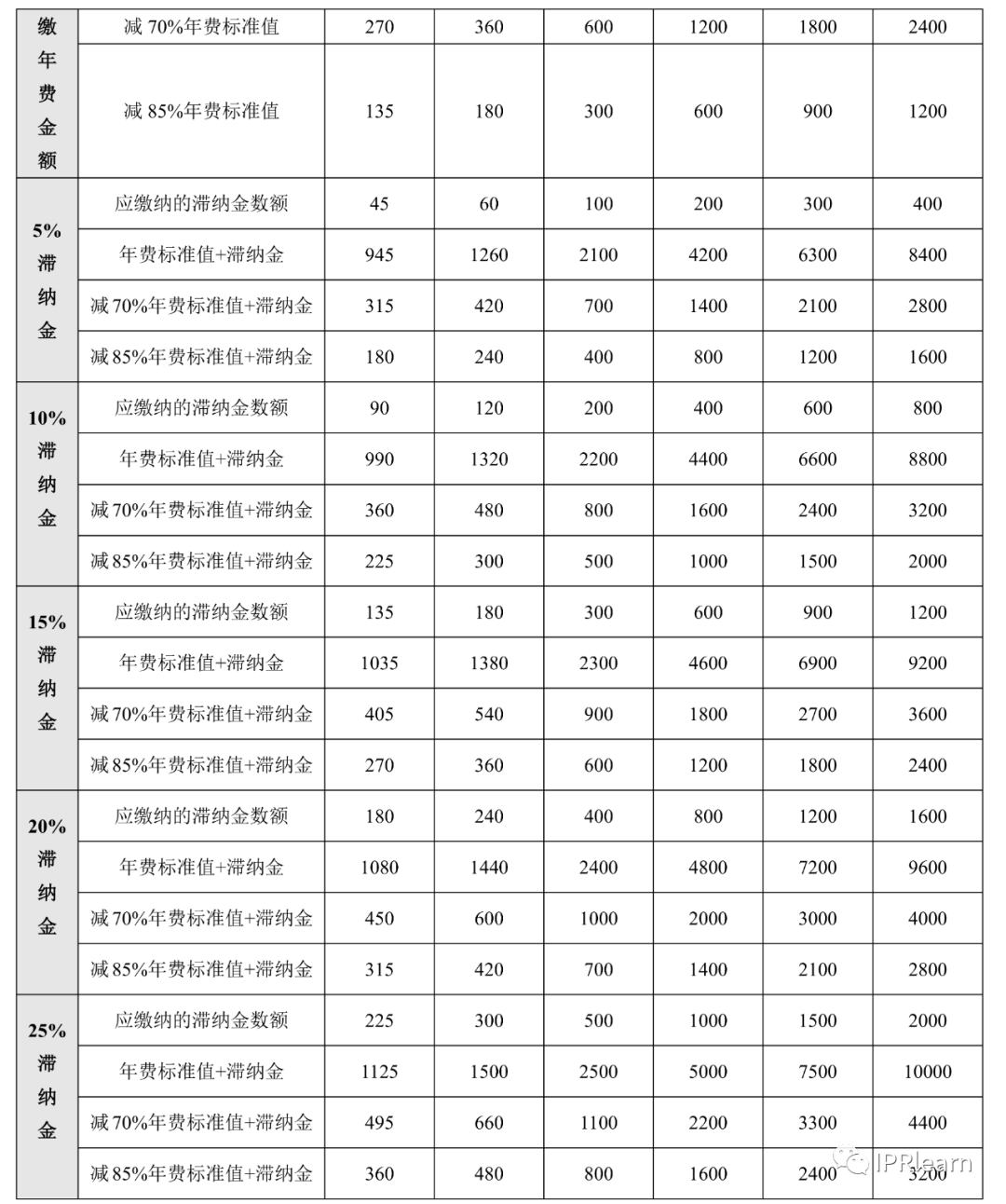 (1)專利權(quán)人未按時繳納年費(不包括授予專利權(quán)當(dāng)年的年費)或者繳納的數(shù)額不足的,可以在年費期滿之日起六個月內(nèi)補繳,補繳時間超過規(guī)定期限但不足一個月時,不繳納滯納金。補繳時間超過規(guī)定時間一個月或以上的,繳納按照下述計算方法算出的相應(yīng)數(shù)額的滯納金: