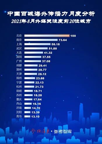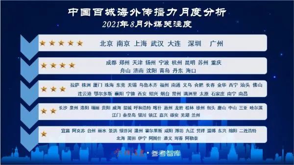 參考消息報社參考智庫日前發(fā)布《中國百城海外傳播力月度分析報告(2021年8月號)》。該報告旨在綜合評估中國城市國際傳播和國際品牌建設效果,為城市決策者、研究者提供國際傳播領(lǐng)域的業(yè)務參考。