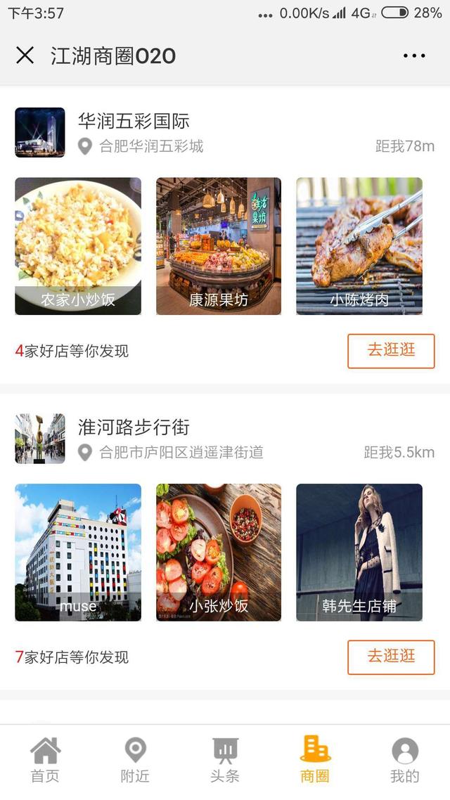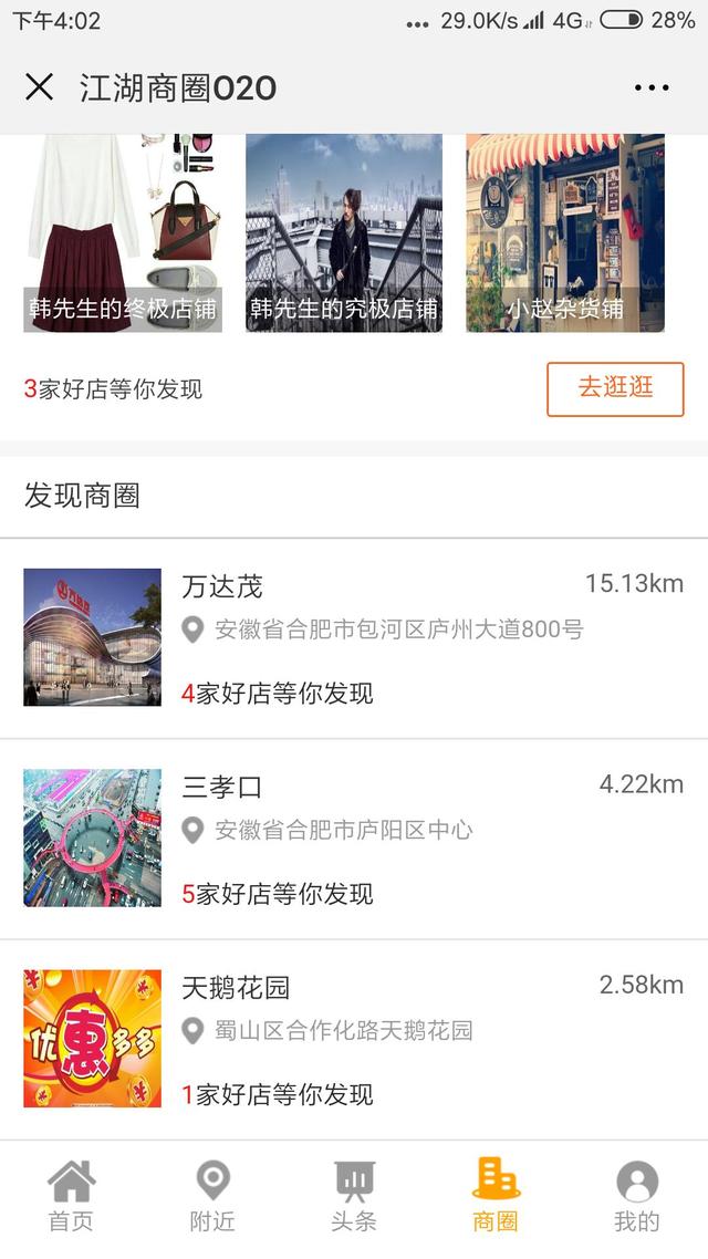 用戶進入商圈,屏幕拉到最下方就可發(fā)現(xiàn)附近的商圈,可以為不同的商圈進行宣傳以及推廣。