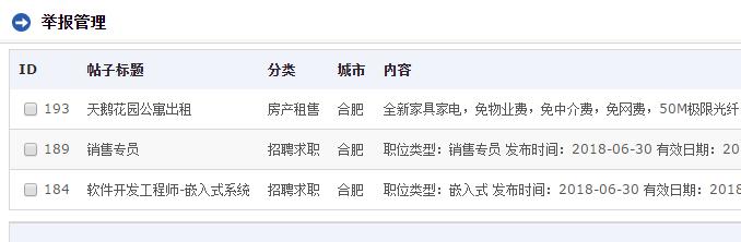 另外新增舉報功能,可以對垃圾帖子、有害帖子、虛假帖子進行舉報。對于用戶舉報的信息、平臺運維人員可以在后臺模塊→同城信息→舉報管理查看,若該信息屬于有害違規(guī)信息,平臺運維人員對信息進行查看、分析以及刪除等操作。