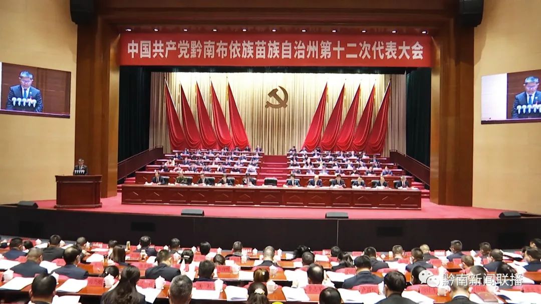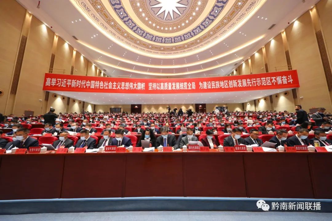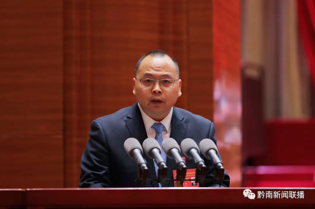 唐德智代表中國共產(chǎn)黨黔南州第十一屆委員會(huì)向大會(huì)作了題為《高舉習(xí)近平新時(shí)代中國特色社會(huì)主義思想偉大旗幟 堅(jiān)持以高質(zhì)量發(fā)展統(tǒng)攬全局 為建設(shè)更高水平民族地區(qū)創(chuàng)新發(fā)展先行示范區(qū)不懈奮斗》的報(bào)告。