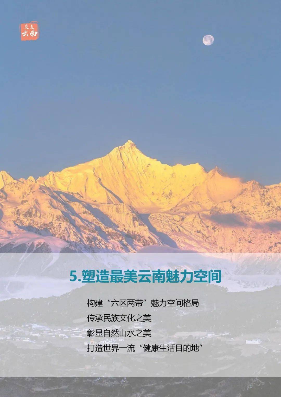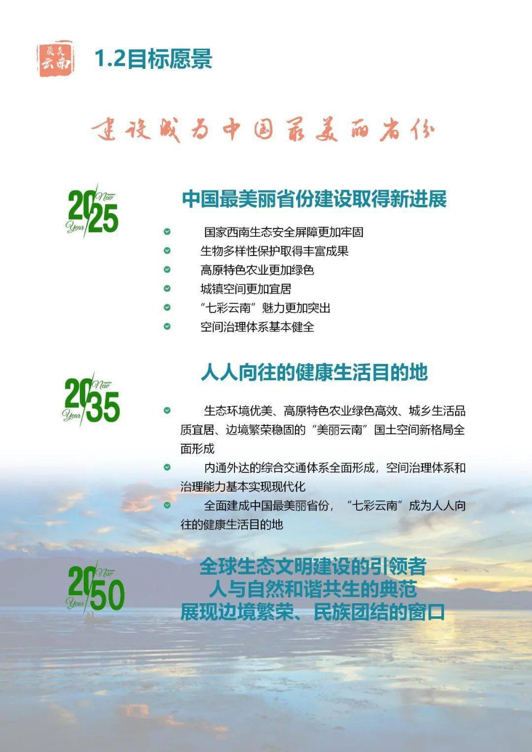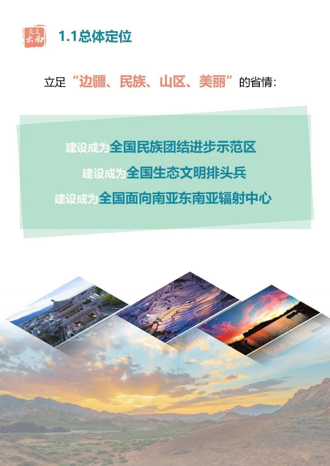 具體而言,云南省總體定位是:全國民族團結進步示范區(qū)、全國生態(tài)文明排頭兵、全國面向南亞東南亞輻射中心,規(guī)劃至2035年建設成為中國最美麗省份,成為人人向往的健康生活目的地。