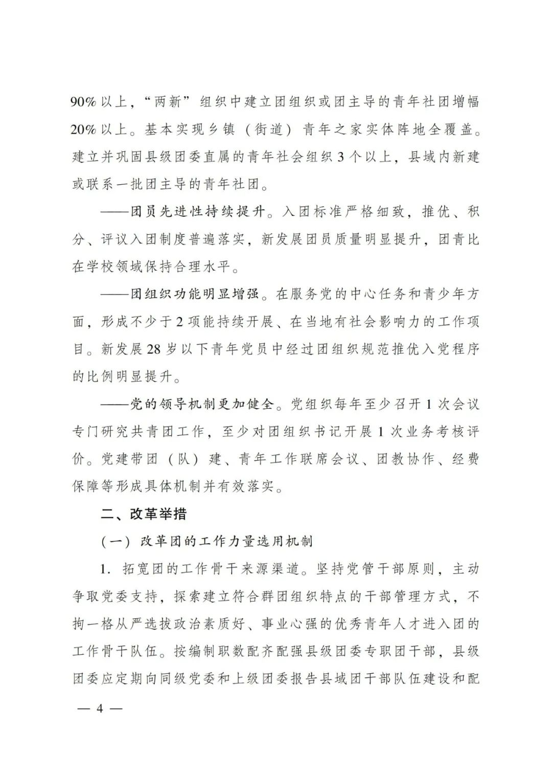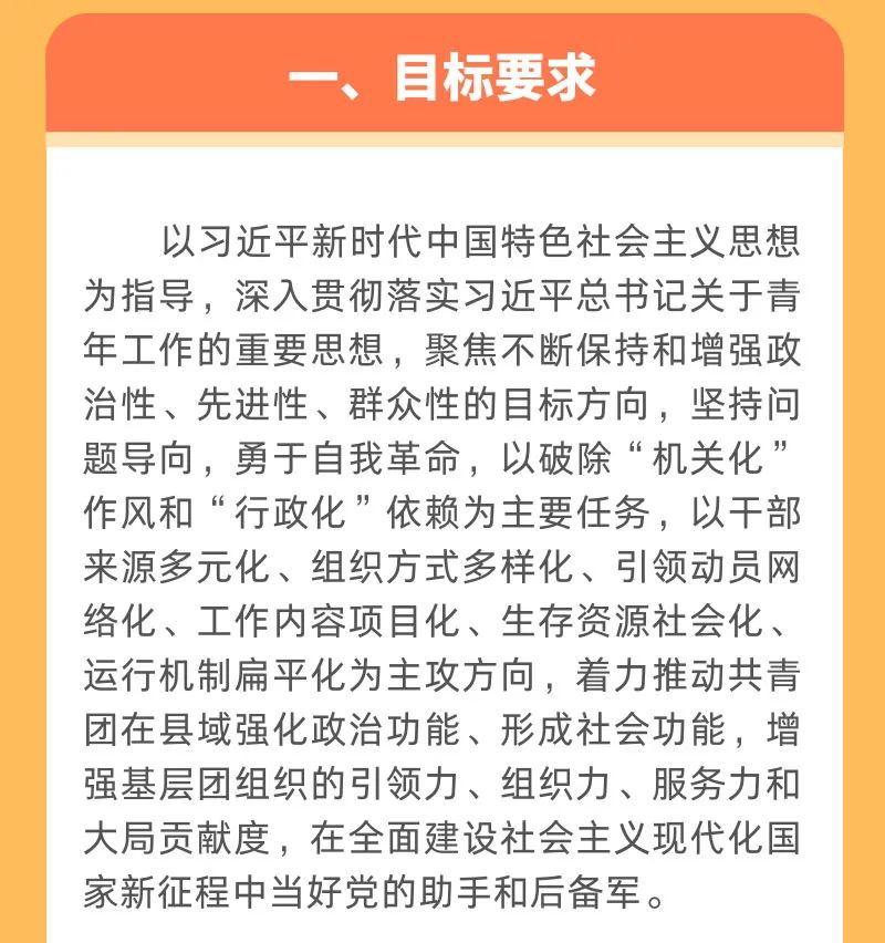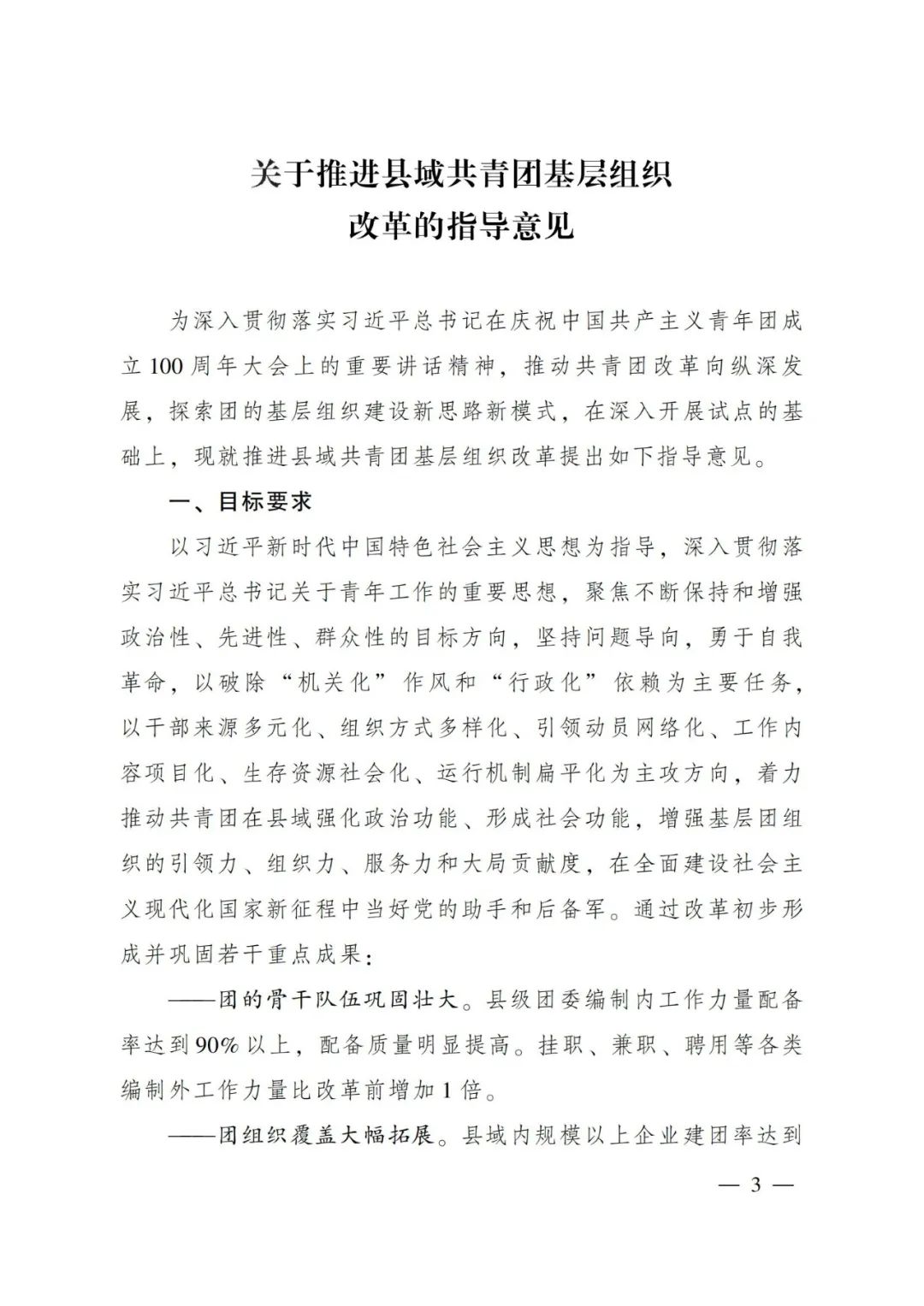 為深入貫徹落實(shí)習(xí)近平總書記在慶祝中國共產(chǎn)主義青年團(tuán)成立100周年大會上的重要講話精神,推動共青團(tuán)改革向縱深發(fā)展,探索團(tuán)的基層組織建設(shè)新思路新模式,在深入開展試點(diǎn)的基礎(chǔ)上,現(xiàn)就推進(jìn)縣域共青團(tuán)基層組織改革提出如下指導(dǎo)意見。 以習(xí)近平新時代中國特色社會主義思想為指導(dǎo),深入貫徹落實(shí)習(xí)近平總書記關(guān)于青年工作的重要思想,聚焦不斷保持和增強(qiáng)政治性、先進(jìn)性、群眾性的目標(biāo)方向,堅持問題導(dǎo)向,勇于自我革命,以破除“機(jī)關(guān)化”作風(fēng)和“行政化”依賴為主要任務(wù),以干部來源多元化、組織方式多樣化、引領(lǐng)動員網(wǎng)絡(luò)化、工作內(nèi)容項目化、生存資源社會化、運(yùn)行機(jī)制扁平化為主攻方向,著力推動共青團(tuán)在縣域強(qiáng)化政治功能、形成社會功能,增強(qiáng)基層團(tuán)組織的引領(lǐng)力、組織力、服務(wù)力和大局貢獻(xiàn)度,在全面建設(shè)社會主義現(xiàn)代化國家新征程中當(dāng)好黨的助手和后備軍。通過改革初步形成并鞏固若干重點(diǎn)成果: ——團(tuán)的骨干隊伍鞏固壯大。縣級團(tuán)委編制內(nèi)工作力量配備率達(dá)到90%以上,配備質(zhì)量明顯提高。掛職、兼職、聘用等各類編制外工作力量比改革前增加1倍。 ——團(tuán)組織覆蓋大幅拓展。縣域內(nèi)規(guī)模以上企業(yè)建團(tuán)率達(dá)到90%以上,“兩新”組織中建立團(tuán)組織或團(tuán)主導(dǎo)的青年社團(tuán)增幅20%以上?;緦?shí)現(xiàn)鄉(xiāng)鎮(zhèn)(街道)青年之家實(shí)體陣地全覆蓋。建立并鞏固縣級團(tuán)委直屬的青年社會組織3個以上,縣域內(nèi)新建或聯(lián)系一批團(tuán)主導(dǎo)的青年社團(tuán)。 ——團(tuán)員先進(jìn)性持續(xù)提升。入團(tuán)標(biāo)準(zhǔn)嚴(yán)格細(xì)致,推優(yōu)、積分、評議入團(tuán)制度普遍落實(shí),新發(fā)展團(tuán)員質(zhì)量明顯提升,團(tuán)青比在學(xué)校領(lǐng)域保持合理水平。 ——團(tuán)組織功能明顯增強(qiáng)。在服務(wù)黨的中心任務(wù)和青少年方面,形成不少于2項能持續(xù)開展、在當(dāng)?shù)赜猩鐣绊懥Φ墓ぷ黜椖?。新發(fā)展28歲以下青年黨員中經(jīng)過團(tuán)組織規(guī)范推優(yōu)入黨程序的比例明顯提升。 ——黨的領(lǐng)導(dǎo)機(jī)制更加健全。黨組織每年至少召開1次會議專門研究共青團(tuán)工作,至少對團(tuán)組織書記開展1次業(yè)務(wù)考核評價。黨建帶團(tuán)(隊)建、青年工作聯(lián)席會議、團(tuán)教協(xié)作、經(jīng)費(fèi)保障等形成具體機(jī)制并有效落實(shí)。(一)改革團(tuán)的工作力量選用機(jī)制