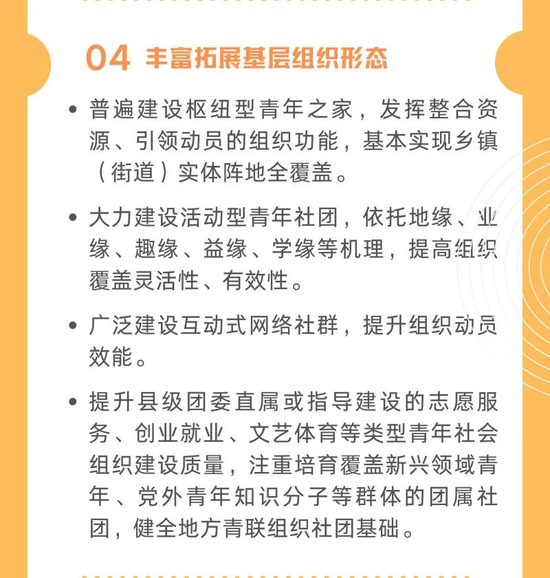近日,經(jīng)黨中央同意,共青團(tuán)中央印發(fā)《關(guān)于推進(jìn)縣域共青團(tuán)基層組織改革的指導(dǎo)意見》(以下簡稱“指導(dǎo)意見”),全面部署推進(jìn)縣域共青團(tuán)基層組織改革。通知指出,黨的十八大以來,黨中央高度重視共青團(tuán)的基層建設(shè)和改革,習(xí)近平總書記多次要求全團(tuán)樹立大抓基層的鮮明導(dǎo)向,推動改革舉措落到基層,把力量和資源充實(shí)到基層,使基層真正強(qiáng)起來。2019年7月,中央書記處專題審議通過了《共青團(tuán)基層組織改革綜合試點(diǎn)方案》;2021年5月,經(jīng)中央領(lǐng)導(dǎo)同志同意,縣域共青團(tuán)基層組織改革試點(diǎn)擴(kuò)大至全國621個縣區(qū)。團(tuán)中央總結(jié)將近三年的實(shí)踐,提出了本指導(dǎo)意見。通知強(qiáng)調(diào),各級團(tuán)組織要堅持改革的正確方向,準(zhǔn)確領(lǐng)會改革意圖,抓住主要矛盾和關(guān)鍵問題,以干部來源多元化、組織方式多樣化、引領(lǐng)動員網(wǎng)絡(luò)化、工作內(nèi)容項目化、生存資源社會化、運(yùn)行機(jī)制扁平化為主攻方向,強(qiáng)化政治功能、形成社會功能,持續(xù)提升基層團(tuán)組織的引領(lǐng)力、組織力、服務(wù)力和大局貢獻(xiàn)度,力爭明年年底前完成縣域共青團(tuán)基層組織改革任務(wù)。縣域共青團(tuán)基層組織改革由省級團(tuán)委統(tǒng)籌,在縣(市、區(qū)、旗)黨委領(lǐng)導(dǎo)下實(shí)施,市、縣兩級團(tuán)委具體抓落實(shí),省、市、縣團(tuán)委書記是第一責(zé)任人。通知要求,全體團(tuán)干部要發(fā)揚(yáng)歷史主動,緊跟時代步伐,大膽解放思想,增強(qiáng)危機(jī)意識,勇于自我革命,忠實(shí)履行職責(zé),始終把工作基點(diǎn)建立在自我奮斗上,以時不我待的精氣神把各項改革任務(wù)落到實(shí)處,以本地區(qū)黨的青年工作改革發(fā)展的實(shí)效體現(xiàn)對黨的忠誠,以實(shí)際行動迎接黨的二十大勝利召開。指導(dǎo)意見明確了縣域共青團(tuán)基層組織改革的目標(biāo)要求。指出要以習(xí)近平新時代中國特色社會主義思想為指導(dǎo),深入貫徹落實(shí)習(xí)近平總書記關(guān)于青年工作的重要思想,聚焦不斷保持和增強(qiáng)政治性、先進(jìn)性、群眾性的目標(biāo)方向,堅持問題導(dǎo)向,勇于自我革命,以破除“機(jī)關(guān)化”作風(fēng)和“行政化”依賴為主要任務(wù),以干部來源多元化、組織方式多樣化、引領(lǐng)動員網(wǎng)絡(luò)化、工作內(nèi)容項目化、生存資源社會化、運(yùn)行機(jī)制扁平化為主攻方向,著力推動共青團(tuán)在縣域強(qiáng)化政治功能、形成社會功能,增強(qiáng)基層團(tuán)組織的引領(lǐng)力、組織力、服務(wù)力和大局貢獻(xiàn)度,在全面建設(shè)社會主義現(xiàn)代化國家新征程中當(dāng)好黨的助手和后備軍。通過改革,在團(tuán)的骨干隊伍鞏固壯大、團(tuán)組織覆蓋大幅拓展、團(tuán)員先進(jìn)性持續(xù)提升、團(tuán)組織功能明顯增強(qiáng)、黨的領(lǐng)導(dǎo)機(jī)制更加健全等方面初步形成并鞏固若干重點(diǎn)成果。指導(dǎo)意見提出了四個方面、共9項改革舉措。改革團(tuán)的工作力量選用機(jī)制方面,重點(diǎn)拓寬團(tuán)的工作骨干來源渠道,堅持黨管干部原則,不拘一格從嚴(yán)選拔政治素質(zhì)好、事業(yè)心強(qiáng)的優(yōu)秀青年人才進(jìn)入團(tuán)的工作骨干隊伍;建立工作目標(biāo)責(zé)任制,區(qū)分縣級團(tuán)委和基層組織,分崗分類定工作職責(zé)、定工作目標(biāo)、定獎懲辦法,增強(qiáng)工作實(shí)績約束。改革組織設(shè)置和動員機(jī)制方面,重點(diǎn)健全縣域團(tuán)的組織體系,加強(qiáng)縣級團(tuán)的代表大會、委員會建設(shè),強(qiáng)化各個領(lǐng)域團(tuán)的組織覆蓋和建設(shè)質(zhì)量;豐富拓展基層組織形態(tài),大力建設(shè)樞紐型青年之家、活動型青年社團(tuán)、互動式網(wǎng)絡(luò)社群,培育團(tuán)屬青年社會組織,提升組織動員效能;改革團(tuán)的資源籌措機(jī)制,充分依托黨賦予的資源和渠道,用好共青團(tuán)內(nèi)生資源,積極爭取社會資源,提高社會化生存能力。改革團(tuán)員發(fā)展和教育管理機(jī)制方面,重點(diǎn)嚴(yán)格入團(tuán)標(biāo)準(zhǔn)和程序,堅持政治標(biāo)準(zhǔn),優(yōu)化規(guī)模結(jié)構(gòu),建立并落實(shí)積分、評議入團(tuán)制度;改進(jìn)團(tuán)員教育管理機(jī)制,聚焦為黨育人,加強(qiáng)政治訓(xùn)練和政治鍛造,提升組織生活質(zhì)量,團(tuán)支部每年開展專題理論學(xué)習(xí)不少于4次;推動黨、團(tuán)、隊育人鏈條銜接貫通,落實(shí)少先隊階梯式成長激勵制度和新時代共青團(tuán)激勵機(jī)制指導(dǎo)大綱,把推優(yōu)入黨作為基層團(tuán)組織履行政治功能的重要抓手。完善黨的領(lǐng)導(dǎo)機(jī)制方面,重點(diǎn)推動增強(qiáng)基層黨建帶團(tuán)建實(shí)效,定期聽取工作匯報,經(jīng)常研究重大問題,支持團(tuán)組織創(chuàng)造性開展工作,健全基層黨建帶團(tuán)(隊)建、青年工作聯(lián)席會議、團(tuán)教協(xié)作、經(jīng)費(fèi)保障等重點(diǎn)機(jī)制,確保黨中央明確的規(guī)定動作落實(shí)到位。共青團(tuán)中央印發(fā)