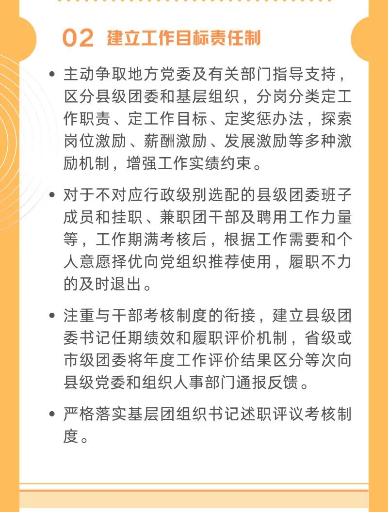 1. 拓寬團(tuán)的工作骨干來源渠道。堅持黨管干部原則,主動爭取黨委支持,探索建立符合群團(tuán)組織特點(diǎn)的干部管理方式,不拘一格從嚴(yán)選拔政治素質(zhì)好、事業(yè)心強(qiáng)的優(yōu)秀青年人才進(jìn)入團(tuán)的工作骨干隊伍。按編制職數(shù)配齊配強(qiáng)縣級團(tuán)委專職團(tuán)干部,縣級團(tuán)委應(yīng)定期向同級黨委和上級團(tuán)委報告縣域團(tuán)干部隊伍建設(shè)和配備情況,上級團(tuán)委依規(guī)加強(qiáng)協(xié)管。充實(shí)縣級團(tuán)委專業(yè)化工作力量,鼓勵有條件的地方建立促進(jìn)青年創(chuàng)新創(chuàng)業(yè)、志愿服務(wù)、新媒體宣傳等職能的青年工作專業(yè)化平臺。用好用足群團(tuán)組織掛職、兼職干部政策,著力提高縣級團(tuán)委班子和其他崗位掛職、兼職團(tuán)干部選配質(zhì)量,增強(qiáng)針對性、適用性。多渠道充實(shí)縣域各級團(tuán)組織工作力量,通過政府購買服務(wù)、選聘青少年事務(wù)社工、選派團(tuán)建指導(dǎo)員、選拔村(社區(qū))青年委員、開發(fā)志愿者服務(wù)項目、吸納大學(xué)生兼職、聘任青年社會組織骨干等方式,實(shí)現(xiàn)社會化選聘、項目化用人。 2. 建立工作目標(biāo)責(zé)任制。主動爭取地方黨委及有關(guān)部門指導(dǎo)支持,區(qū)分縣級團(tuán)委和基層組織,分崗分類定工作職責(zé)、定工作目標(biāo)、定獎懲辦法,探索崗位激勵、薪酬激勵、發(fā)展激勵等多種激勵機(jī)制,增強(qiáng)工作實(shí)績約束。對于不對應(yīng)行政級別選配的縣級團(tuán)委班子成員和掛職、兼職團(tuán)干部及聘用工作力量等,工作期滿考核后,根據(jù)工作需要和個人意愿擇優(yōu)向黨組織推薦使用,履職不力的及時退出。注重與干部考核制度的銜接,建立縣級團(tuán)委書記任期績效和履職評價機(jī)制,省級或市級團(tuán)委將年度工作評價結(jié)果區(qū)分等次向縣級黨委和組織人事部門通報反饋。嚴(yán)格落實(shí)基層團(tuán)組織書記述職評議考核制度。 3. 健全縣域團(tuán)的組織體系。加強(qiáng)縣級團(tuán)的代表大會、委員會建設(shè),根據(jù)履職需要嚴(yán)格遴選代表、委員,注重吸納團(tuán)員人數(shù)多、社會影響力大、穩(wěn)定性較強(qiáng)和新興領(lǐng)域的基層團(tuán)組織負(fù)責(zé)人進(jìn)入縣級團(tuán)的委員會。持續(xù)深化縣域團(tuán)代表聯(lián)絡(luò)站建設(shè),落實(shí)“兩聯(lián)”工作機(jī)制。大力鞏固基本盤,加強(qiáng)黨政機(jī)關(guān)、事業(yè)單位、國有企業(yè)、學(xué)校、鄉(xiāng)鎮(zhèn)(街道)、村(社區(qū))等傳統(tǒng)領(lǐng)域團(tuán)的組織覆蓋、提升建設(shè)質(zhì)量。在城市基層,著力做實(shí)做強(qiáng)城市街道區(qū)域化共建委員會,增強(qiáng)社區(qū)團(tuán)組織直接聯(lián)系服務(wù)青少年的能力。在農(nóng)村基層,采取單獨(dú)組建、村村聯(lián)建、村企聯(lián)建、村社聯(lián)建和合作社、產(chǎn)業(yè)鏈建團(tuán)等多種方式,鞏固組織基礎(chǔ)。通過黨建帶動、區(qū)域聯(lián)動、行業(yè)推動、系統(tǒng)促動、園區(qū)牽動、社團(tuán)驅(qū)動、網(wǎng)絡(luò)互動等多種路徑,加強(qiáng)對“兩新”組織和各類新興領(lǐng)域青年群體的組織覆蓋。適應(yīng)城鄉(xiāng)青年就業(yè)分布狀況,在團(tuán)員青年較集中的區(qū)域或行業(yè)派出團(tuán)工委,配置工作力量。 4. 豐富拓展基層組織形態(tài)。普遍建設(shè)樞紐型青年之家,發(fā)揮整合資源、引領(lǐng)動員的組織功能,基本實(shí)現(xiàn)鄉(xiāng)鎮(zhèn)(街道)實(shí)體陣地全覆蓋。大力建設(shè)活動型青年社團(tuán),依托地緣、業(yè)緣、趣緣、益緣、學(xué)緣等機(jī)理,提高組織覆蓋靈活性、有效性。廣泛建設(shè)互動式網(wǎng)絡(luò)社群,提升組織動員效能。提升縣級團(tuán)委直屬或指導(dǎo)建設(shè)的志愿服務(wù)、創(chuàng)業(yè)就業(yè)、文藝體育等類型青年社會組織建設(shè)質(zhì)量,注重培育覆蓋新興領(lǐng)域青年、黨外青年知識分子等群體的團(tuán)屬社團(tuán),健全地方青聯(lián)組織社團(tuán)基礎(chǔ)。 5. 改革團(tuán)的資源籌措機(jī)制。充分依托黨賦予的資源和渠道,用好共青團(tuán)內(nèi)生資源,積極爭取社會資源,逐步建立資源使用績效評價和監(jiān)督機(jī)制,提高社會化生存能力。鞏固黨政支持保障,完善政府購買青少年社會工作服務(wù)機(jī)制。采取扁平化、項目化方式,推進(jìn)各級團(tuán)的領(lǐng)導(dǎo)機(jī)關(guān)把力量和資源充實(shí)到基層,一體實(shí)施“小而實(shí)”的工作項目,為基層團(tuán)組織賦能。圍繞地方黨委中心任務(wù)和青少年需求,推動基層團(tuán)組織在鄉(xiāng)村振興、志愿服務(wù)、濟(jì)困助學(xué)、就業(yè)創(chuàng)業(yè)、人才培養(yǎng)、實(shí)踐育人等領(lǐng)域,打造常態(tài)開展、長期堅持、具有穩(wěn)定政治功能和社會影響力的項目品牌,切實(shí)幫助青少年解決“急難愁盼”問題,有效服務(wù)大局和青少年。