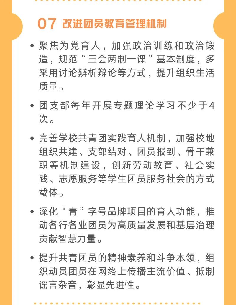6. 嚴(yán)格入團(tuán)標(biāo)準(zhǔn)和程序。堅持政治標(biāo)準(zhǔn),建立并落實(shí)積分、評議入團(tuán)制度,落實(shí)少先隊推優(yōu)機(jī)制,逐步將思政課考評優(yōu)良、團(tuán)課學(xué)習(xí)合格、積極參與志愿服務(wù)作為入團(tuán)的必備條件,提高團(tuán)員發(fā)展質(zhì)量。優(yōu)化規(guī)模結(jié)構(gòu),重視初中、中職(技工)、民辦和農(nóng)村學(xué)校發(fā)展團(tuán)員工作,鞏固在初中畢業(yè)班及以上學(xué)段班級建立團(tuán)支部,加大社會領(lǐng)域團(tuán)員發(fā)展力度。嚴(yán)格團(tuán)員發(fā)展程序和工作紀(jì)律,從嚴(yán)從實(shí)做好違規(guī)發(fā)展團(tuán)員核查處置。 7. 改進(jìn)團(tuán)員教育管理機(jī)制。聚焦為黨育人,加強(qiáng)政治訓(xùn)練和政治鍛造,規(guī)范“三會兩制一課”基本制度,多采用討論辨析辯論等方式,提升組織生活質(zhì)量。團(tuán)支部每年開展專題理論學(xué)習(xí)不少于4次。完善學(xué)校共青團(tuán)實(shí)踐育人機(jī)制,加強(qiáng)校地組織共建、支部結(jié)對、團(tuán)員報到、骨干兼職等機(jī)制建設(shè),創(chuàng)新勞動教育、社會實(shí)踐、志愿服務(wù)等學(xué)生團(tuán)員服務(wù)社會的方式載體。深化“青”字號品牌項目的育人功能,推動各行各業(yè)團(tuán)員為高質(zhì)量發(fā)展和基層治理貢獻(xiàn)智慧力量。提升共青團(tuán)員的精神素養(yǎng)和斗爭本領(lǐng),組織動員團(tuán)員在網(wǎng)絡(luò)上傳播主流價值、抵制謠言雜音,彰顯先進(jìn)性。 8. 推動黨、團(tuán)、隊育人鏈條銜接貫通。加強(qiáng)全團(tuán)帶隊,落實(shí)少先隊階梯式成長激勵制度,遞進(jìn)開展分批入隊、分段教育、分級激勵。規(guī)范落實(shí)新時代共青團(tuán)激勵機(jī)制指導(dǎo)大綱,綜合實(shí)施入團(tuán)激勵、評議激勵、榮譽(yù)激勵、機(jī)會激勵、發(fā)展激勵,每年開展團(tuán)員先進(jìn)性評價。把推優(yōu)入黨作為基層團(tuán)組織履行政治功能的重要抓手,落實(shí)“兩個一般、兩個主要”要求,按照共青團(tuán)推優(yōu)入黨工作實(shí)施辦法,規(guī)范和加強(qiáng)推優(yōu)入黨工作機(jī)制,將共青團(tuán)員榮譽(yù)激勵和先進(jìn)性評價結(jié)果作為“推優(yōu)”的重要依據(jù)。