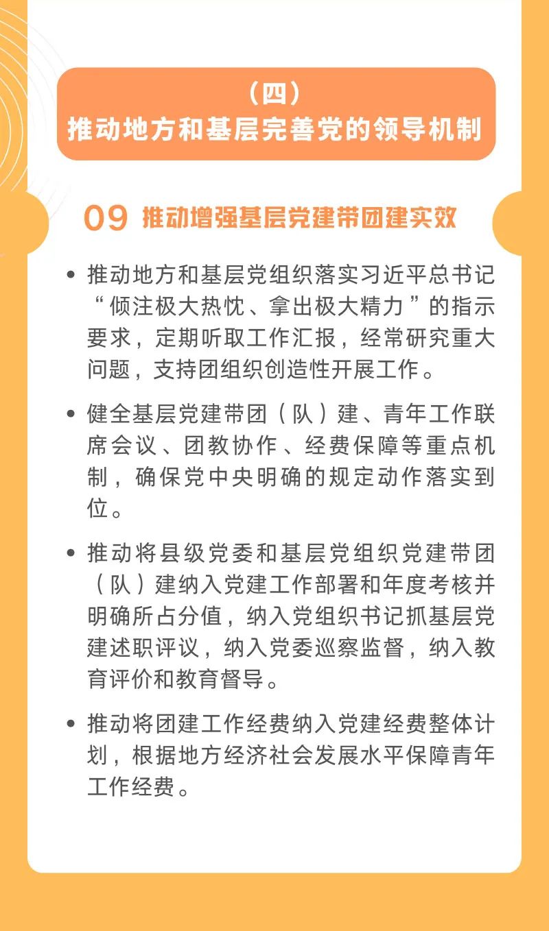 9. 推動增強(qiáng)基層黨建帶團(tuán)建實(shí)效。推動地方和基層黨組織落實(shí)習(xí)近平總書記“傾注極大熱忱、拿出極大精力”的指示要求,定期聽取工作匯報,經(jīng)常研究重大問題,支持團(tuán)組織創(chuàng)造性開展工作。健全基層黨建帶團(tuán)(隊)建、青年工作聯(lián)席會議、團(tuán)教協(xié)作、經(jīng)費(fèi)保障等重點(diǎn)機(jī)制,確保黨中央明確的規(guī)定動作落實(shí)到位。推動將縣級黨委和基層黨組織黨建帶團(tuán)(隊)建納入黨建工作部署和年度考核并明確所占分值,納入黨組織書記抓基層黨建述職評議,納入黨委巡察監(jiān)督,納入教育評價和教育督導(dǎo)。推動將團(tuán)建工作經(jīng)費(fèi)納入黨建經(jīng)費(fèi)整體計劃,根據(jù)地方經(jīng)濟(jì)社會發(fā)展水平保障青年工作經(jīng)費(fèi)。 縣域共青團(tuán)基層組織改革由省級團(tuán)委統(tǒng)籌,在縣(市、區(qū)、旗)黨委領(lǐng)導(dǎo)下實(shí)施,市、縣兩級團(tuán)委具體抓落實(shí),2023年底基本完成。省、市、縣級團(tuán)委書記作為第一責(zé)任人,要主動爭取各方支持,推動各項措施納入黨委全面深化改革的整體格局。省、市、縣級團(tuán)委要依據(jù)本意見精神和地方實(shí)際,積極爭取黨委改革辦、紀(jì)檢監(jiān)察、組織、財政、民政、教育等部門的指導(dǎo)支持,制定具體保障措施,重點(diǎn)推動干部制度改革和納入改革督察、黨建考核、巡視巡察、購買服務(wù)等改革措施落地。 團(tuán)中央、省級團(tuán)委通過組建專班、集中培訓(xùn)、項目案例、交流觀摩等加強(qiáng)具體指導(dǎo),及時推廣改革好做法好經(jīng)驗,宣傳改革進(jìn)展和成效。建立改革情況向黨組織請示報告和溝通反饋機(jī)制,省、市、縣級團(tuán)委要將改革推進(jìn)情況作為向上級團(tuán)組織請示報告和主要負(fù)責(zé)同志年度述職考核的重要內(nèi)容。落實(shí)全面從嚴(yán)治團(tuán)要求,對改革重視不夠、推進(jìn)緩慢的團(tuán)組織及其主要負(fù)責(zé)同志,要及時提醒約談、督促整改;不履行或不正確履行職責(zé)導(dǎo)致改革嚴(yán)重滯后的應(yīng)嚴(yán)肅追責(zé)問責(zé)。西部陸海新通道經(jīng)濟(jì)帶,中國天眼,東方瑞士,山地公園省,醉美多彩貴州風(fēng),數(shù)字中國云上貴州省智慧黔南州大美獨(dú)山縣匯特通知身邊鄉(xiāng)村振興電子商務(wù)大數(shù)據(jù)百姓生活便民信息新聞網(wǎng)訊