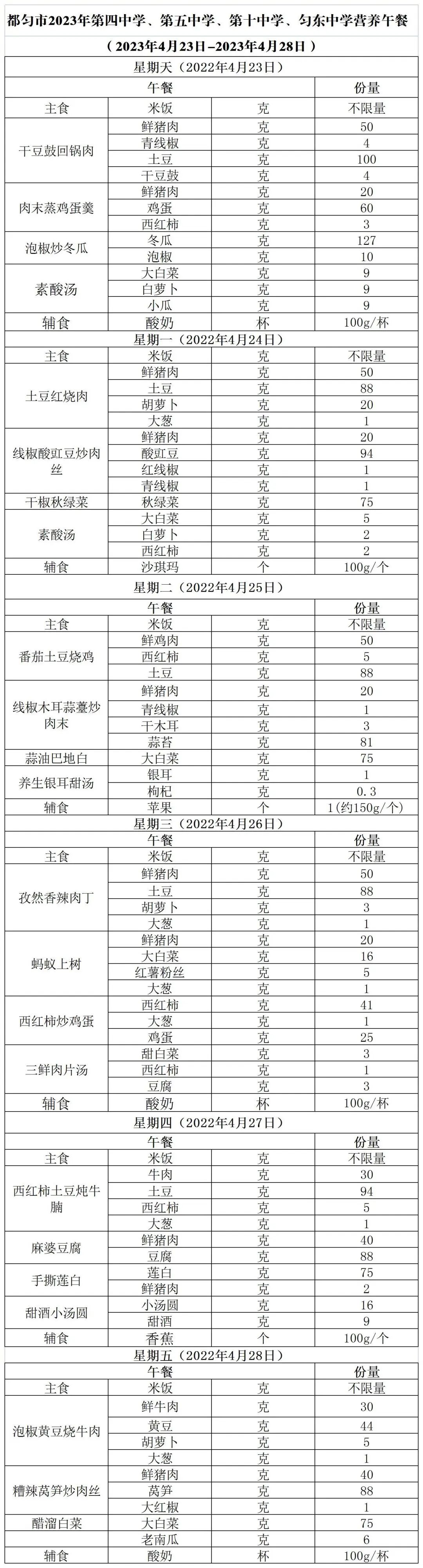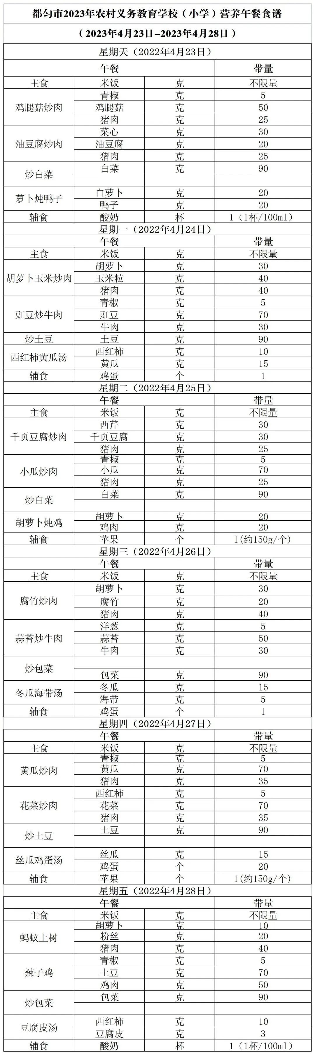 貴州省黔南州都勻市2023年4月23日至4月28日義務(wù)教育學(xué)生營養(yǎng)午餐食譜公示