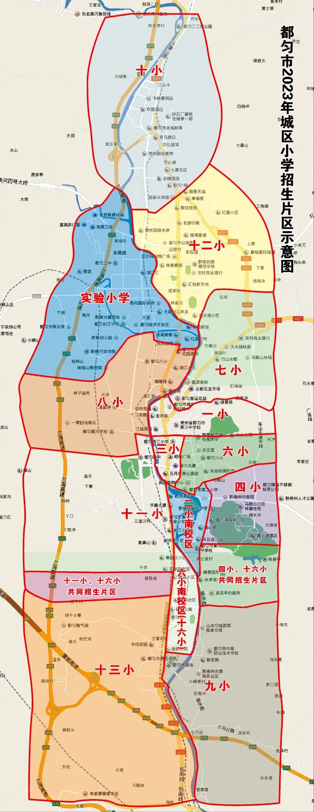 四是都勻二小新校區(qū)招生范圍東面從長(zhǎng)秀路與長(zhǎng)安路交匯處,沿長(zhǎng)安路經(jīng)大坪坡至世強(qiáng)商砼路口(原茶場(chǎng)三中隊(duì));南面從世強(qiáng)商砼路口(原茶場(chǎng)三中隊(duì)),沿青云湖大道東段到青云湖大道東段與旗山大道中段交匯處,再?gòu)那嘣坪蟮罇|段與旗山大道中段交匯處向南沿旗山大道中段到旗山大道中段與清荷路交匯處,沿清荷路向西至清荷路與云和路交匯處;西面從云和路與清荷路交匯處,沿云和路經(jīng)湘才學(xué)校、幸福隧道東口至穆老坡坡頂;北面從穆老坡坡頂,經(jīng)雷打巖、貴品萬(wàn)國(guó)酒店,沿長(zhǎng)秀路到長(zhǎng)秀路與長(zhǎng)安路交匯處。其他城區(qū)小學(xué)招生維持2022年招生區(qū)域不變。