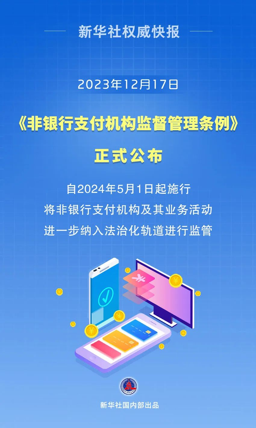 12月17日,《非銀行支付機構(gòu)監(jiān)督管理條例》(以下簡稱《條例》)正式公布,自2024年5月1日起施行。