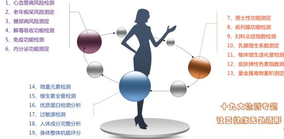 ⑥全面性:包含十九個大類、一百多個檢測項目,給身體一個全面準確的亞健康篩查。