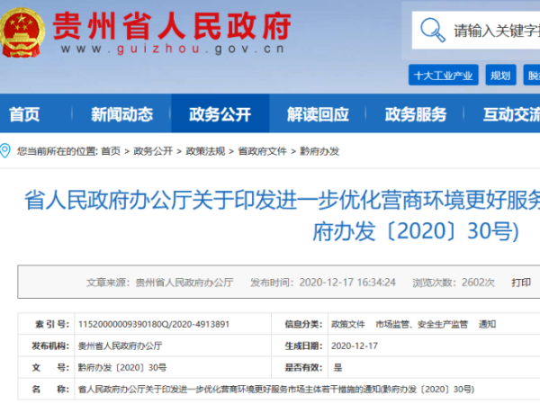 近日,貴州省人民政府辦公廳下發(fā)《關(guān)于印發(fā)進(jìn)一步優(yōu)化營(yíng)商環(huán)境更好服務(wù)市場(chǎng)主體若干措施的通知》。措施共九條,包含深入貫徹落實(shí)《優(yōu)化營(yíng)商環(huán)境條例》、開展?fàn)I商環(huán)境評(píng)價(jià)指標(biāo)專項(xiàng)改革、開展第三方營(yíng)商環(huán)境專項(xiàng)評(píng)估、