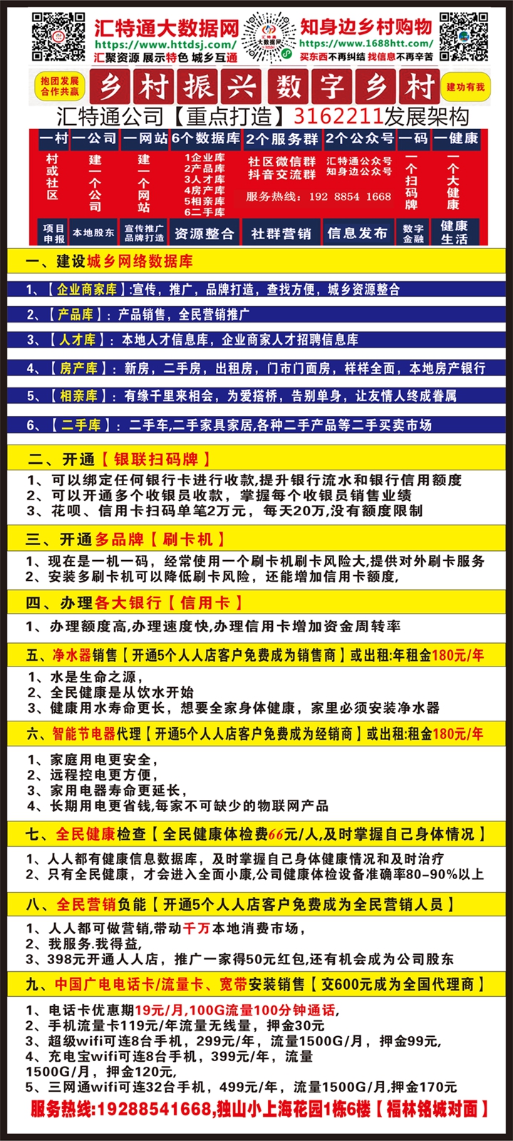 匯特通公司重點(diǎn)打造社區(qū)農(nóng)村1161211鄉(xiāng)村振興服務(wù)體系。一公司,一網(wǎng),6庫(kù)。一群,2公眾號(hào)。一支付,一健康的71服務(wù)體系建設(shè)。一公司:社區(qū)農(nóng)村鄉(xiāng)村振興有限公司。方便更多民眾創(chuàng)業(yè)投資。一網(wǎng):每個(gè)社區(qū)農(nóng)