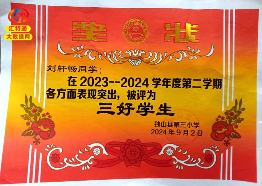 祝賀獨(dú)山縣第三小學(xué)2024年9月五年級下學(xué)期劉軒暢獲評為三好學(xué)生