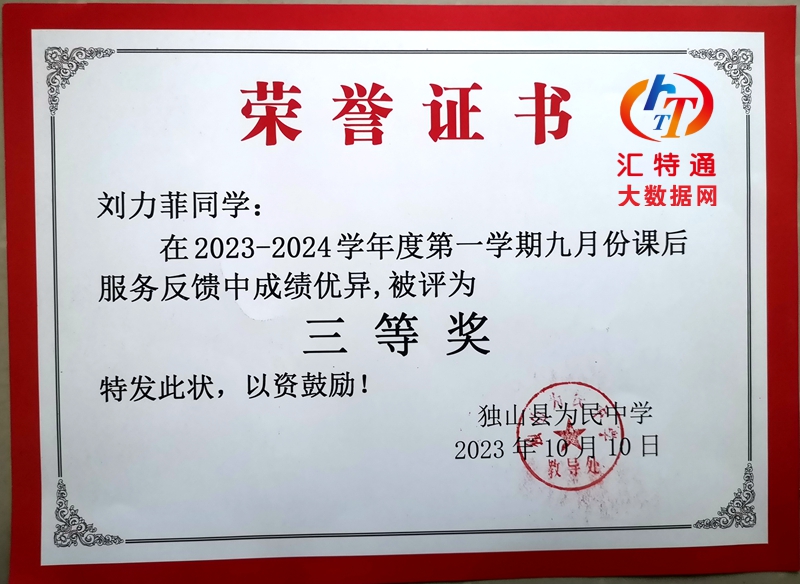 獨山縣為民中學(xué)八(6)班劉力菲榮獲2023年第一學(xué)期年級成績?nèi)泉? 獨山縣為民中學(xué)八(6)班劉力菲在2023--2024學(xué)年度第一學(xué)期九月份課后服務(wù)反饋中成績優(yōu)異,被評為年級三等獎,特發(fā)此狀,以資鼓勵。獨山縣為民中學(xué)教導(dǎo)處。