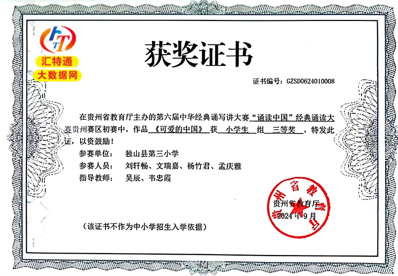 2024年9月祝賀獨山縣第三小學(xué)劉軒暢等榮獲貴州省教育廳主辦的中華經(jīng)典誦寫講大賽貴州賽區(qū),誦讀中國小學(xué)生組三等獎。 參賽單位:獨山縣第三小學(xué) 參與比賽人員名單:劉軒暢、文瑞嘉、楊竹君、孟慶雅 指導(dǎo)老師:吳辰、韋忠霞