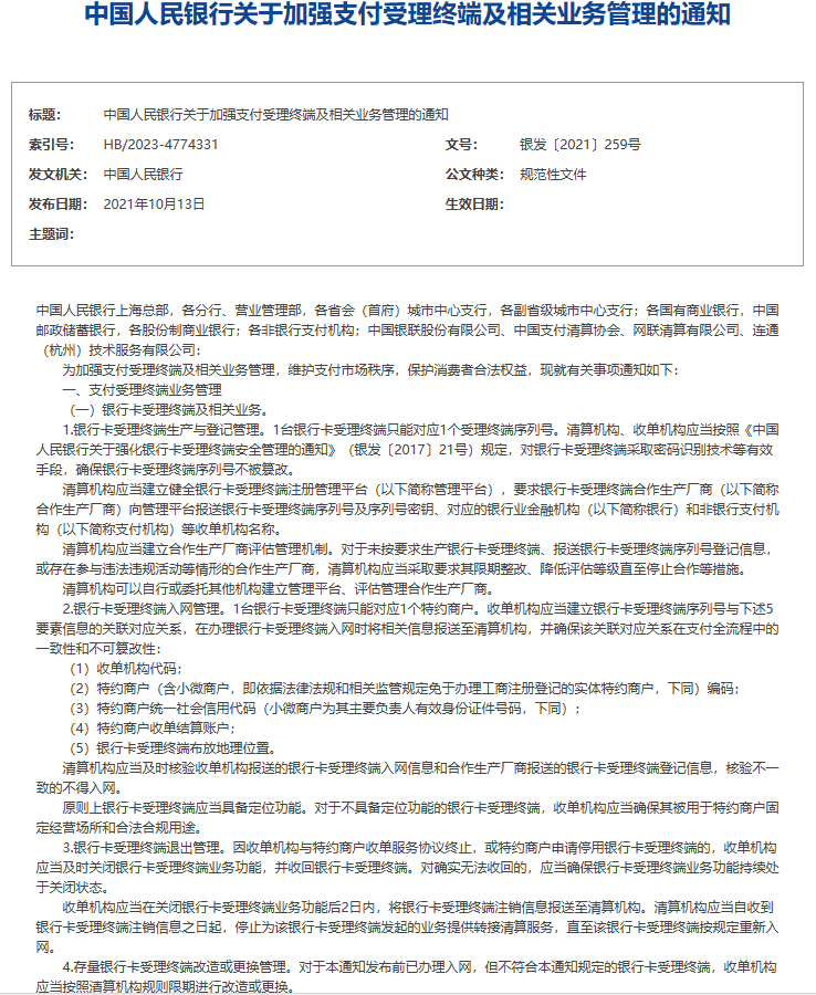 259文件究竟是什么?2021年10月13日,人民銀行發(fā)布了《中國人民銀行關(guān)于加強支付受理終端及相關(guān)業(yè)務(wù)管理的通知》(簡稱259號文件),從支付受理終端業(yè)務(wù)管理、特約商戶管理、收單業(yè)務(wù)監(jiān)測三個方面入手