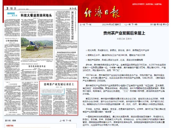 《經(jīng)濟日報》刊發(fā)《貴州茶產(chǎn)業(yè)發(fā)展后來居上》,強力推動貴州省茶產(chǎn)業(yè)高質(zhì)量發(fā)展的“組合拳”,持續(xù)發(fā)展壯大茶產(chǎn)業(yè)。
