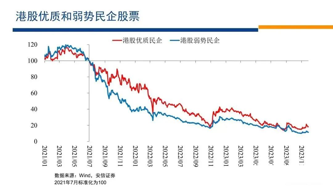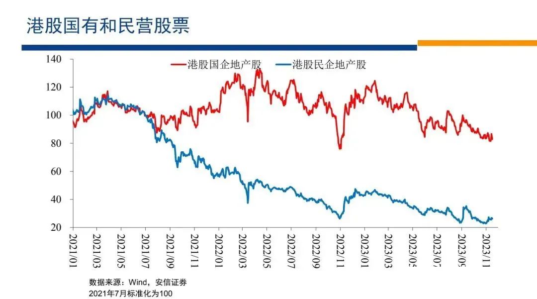 然后我們還可以再看股票市場的情況,我們看到在現(xiàn)金流大幅流出的條件下,民營企業(yè)的股票大幅下跌,國有企業(yè)的股票以2021年7月份為起點(diǎn),沒有怎么下跌。