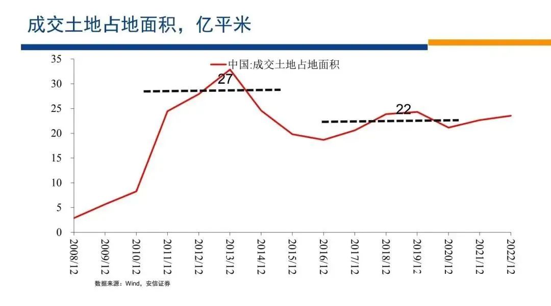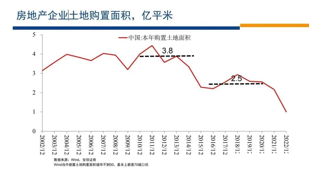 我們再來從房地產(chǎn)企業(yè)的角度來看問題,它的土地購置面積從3.8億平米下降到2.5億平米。
