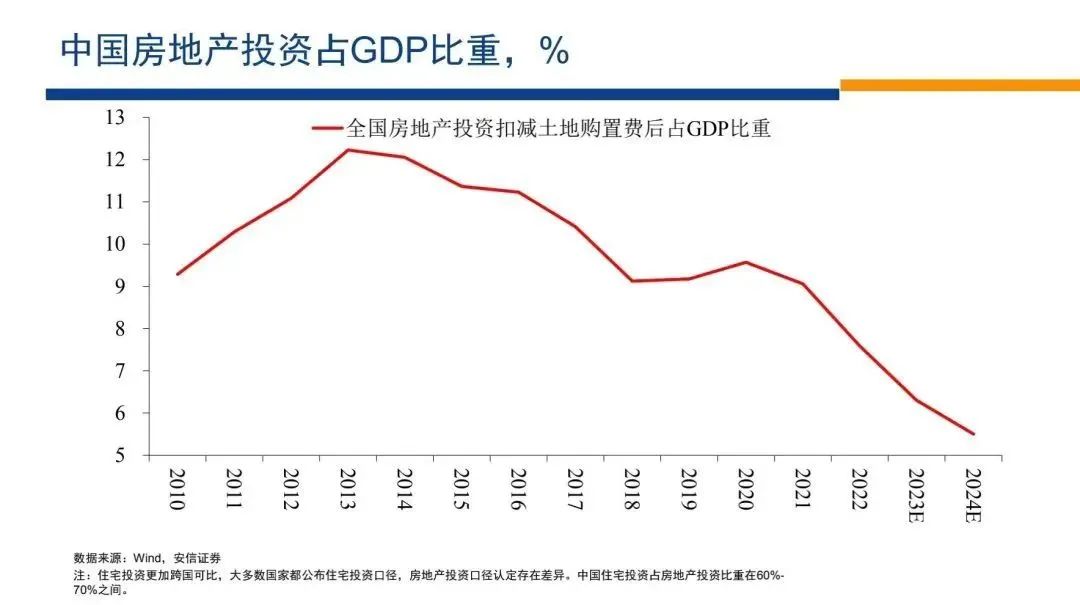 我們在這里想補(bǔ)充的事實(shí)是,到2024年的時候,中國房地產(chǎn)投資占GDP的比重應(yīng)該就會跌破6%,也許會跌到5.5%、5.7%左右的水平。