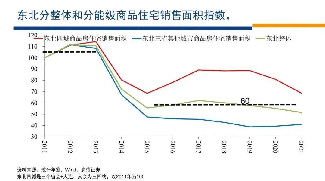 這個是我們想說的第三個方面比較主要的原因。那么這些原因毫無疑問都有關(guān)系,但是如果我們觀察東北四城的影響,就是教培的整頓,互聯(lián)網(wǎng)的整頓等等,也許對他們的影響沒有那么大,但是東北4城的相對表現(xiàn)跟全國是一樣的。而東北4城房地產(chǎn)市場經(jīng)歷劇烈調(diào)整以后,實(shí)際上它后來處在一個相對全國更弱的水平上。