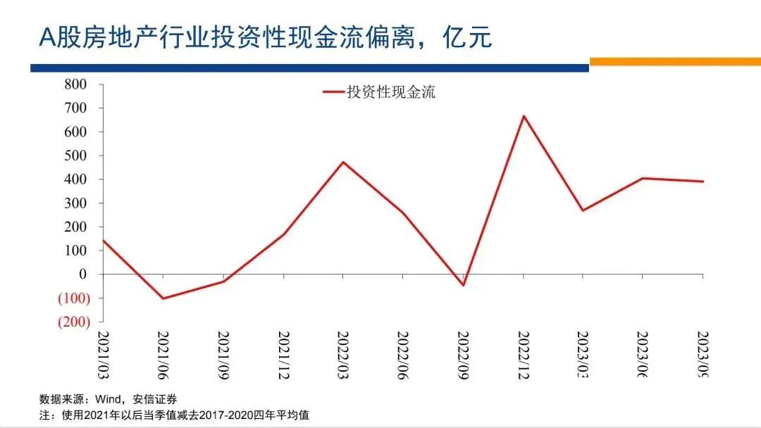 我們再來看他們的投資性現(xiàn)金流,房地產(chǎn)行業(yè)的投資性現(xiàn)金流在2021年以來是大幅改善,相對以前的正常水平經(jīng)歷了極其顯著的改善。