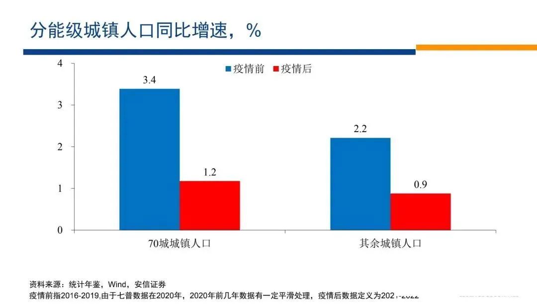 我們觀察第一個就是疫情之前跟疫情期間相比,城鎮(zhèn)人口的增速,我們看到70大城市疫情之前,城鎮(zhèn)人口增速的均值是3.4,疫情以來下降到1.2,下降了2.2個百分點(diǎn),而小城市從2.2下降到0.9,下降了1.3個百分點(diǎn)。