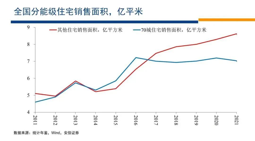 盡管每年人口增長超過3%,但是住宅的絕對銷售規(guī)模就穩(wěn)定在7億平米不再增長,但是大量的中小城市住宅的銷售規(guī)模,卻快速的上升到接近9億平米的水平。