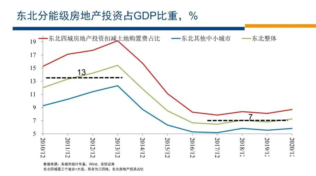無論是從人口的角度來看,還是從住宅銷售面積的絕對水平的變化來看,我們都可以認(rèn)為,東北地區(qū)房地產(chǎn)和城市化的高峰早已經(jīng)結(jié)束,市場已經(jīng)在一個萎縮、人口外遷的背景下穩(wěn)定下來。在這樣的背景下,東北地區(qū)房地產(chǎn)投資的占比,會給我們提供一些有益的啟發(fā)。