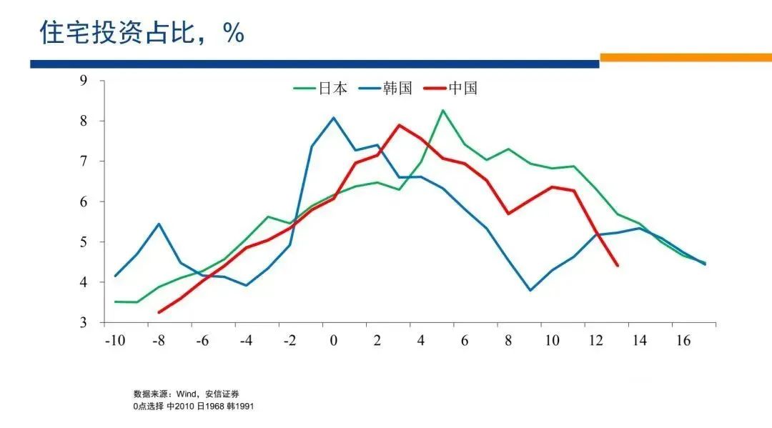 中國住宅投資占GDP的比重,即便在它最峰值的水平,相對日韓相似的發(fā)展階段,基本上是在一個段位上,并沒有顯著的更高。走過這個峰值之后,住宅投資占GDP的比重都開始下降,但是中國的下降過程相對他們而言,也沒有顯著的變得更緩慢。