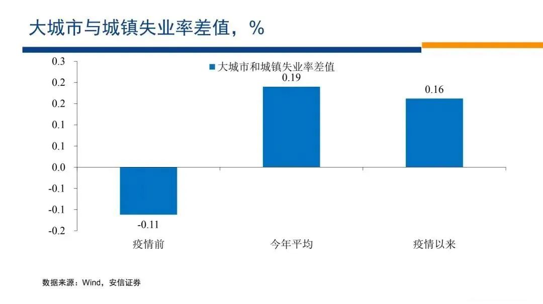 我們再來看失業(yè)率,在疫情之前,大城市的失業(yè)率比小城市要低0.1個點(diǎn),疫情以來它比小城市要高0.16個點(diǎn),今年以來比小城市要高0.2個點(diǎn),本來大城市的失業(yè)率更低,但是疫情以來它都要更高,今年以來它跟全國的水平的差距比疫情那幾年還要更大。